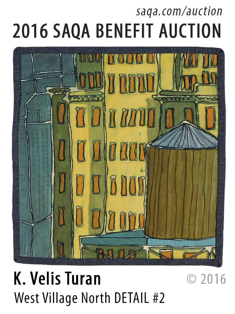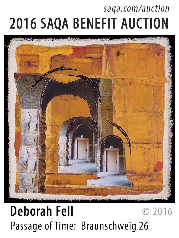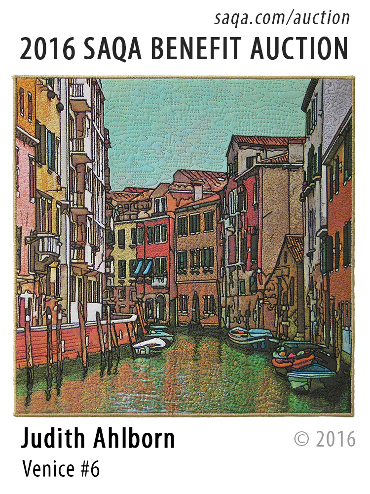 Every year Studio Art Quilt Associates (SAQA) holds an online auction of amazing 12″ x 12″ art quilts. They invite the public to post their dream collection of six pieces. Deb and I just love perusing the collection to pick out what we would like to hang on our wall (and, of course, really bid on). Here is my collection (Deb will post hers next week). The auction starts on September 16. You will probably find at least one piece you would like to own. I found at least six! Click here to view all the auction pieces.
