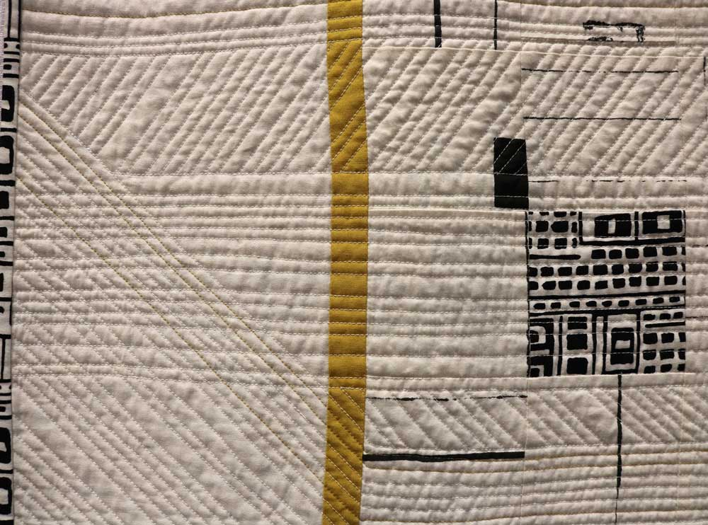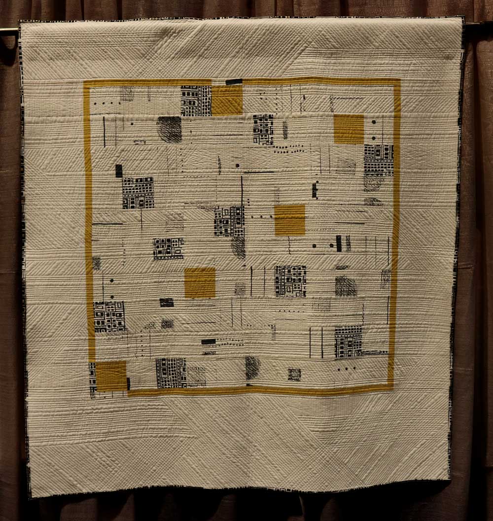 Then there were the quilts with quilting that spoke to me. Another one of the Mid-century modern quilts, Bev Bird’s White Spaces was one. The artist stated she was inspired by André Courrèges. If you’re not familiar with the name, Google him. If you’re my age, you’ll certainly be familiar with his fashions. I love it when something in a statement leads me to investigate further. After looking up Courrèges, I can’t say I see the connection between Courrèges’ iconical work (not that I’ve seen much of it) and Bird’s, but it does read mid-century. I love the quilting lines! Kris and I use a lot of straight-ish (we call them organic) lines in our text quilts. But Bird takes the lines one step further. She varies the direction, and sometimes the lines intersect. It makes for wonderful texture in the quilt.