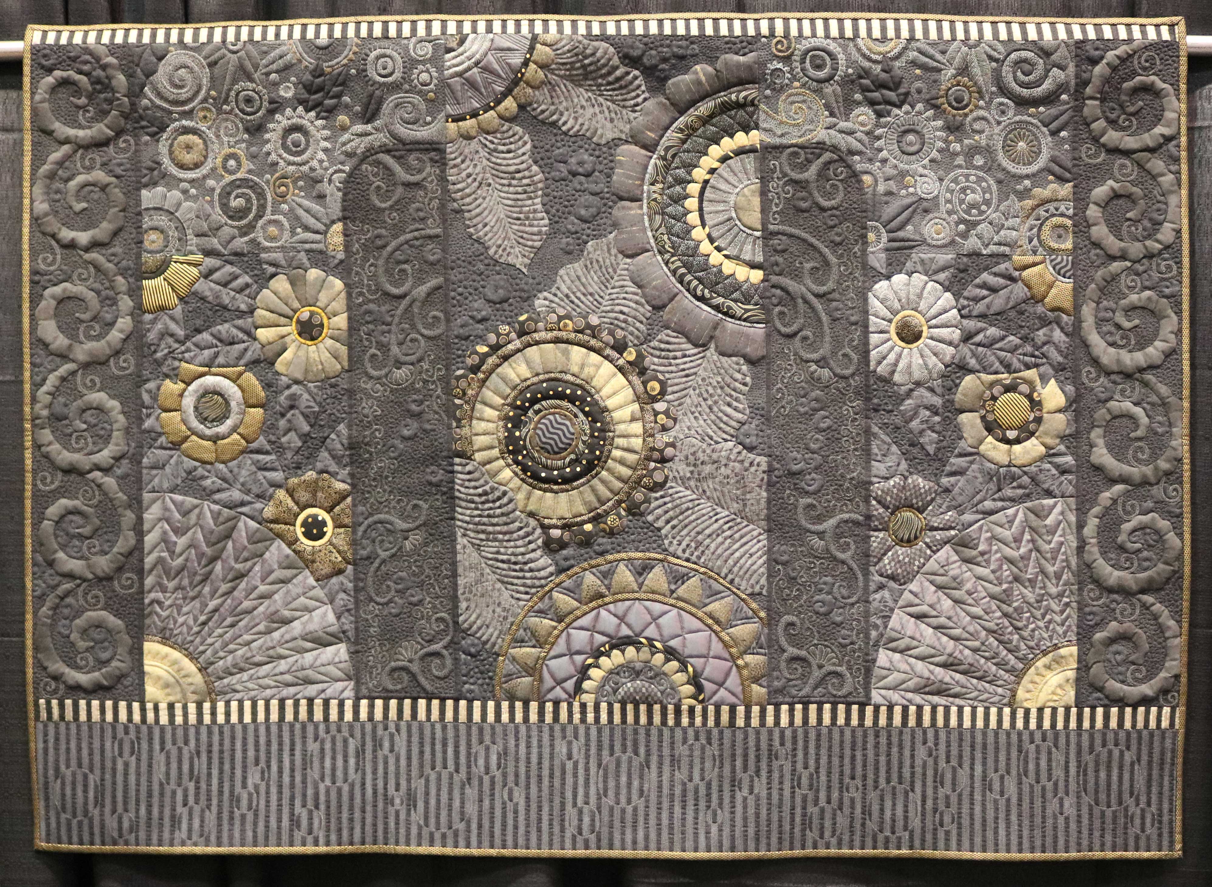 Jan Hutchison’s Sunflower Deco, was a visual feast. Lots of stitching and trapunto. But what really caught my attention was the stitching of the stripes at the bottom of the quilt. A simple but effective use of straight lines.